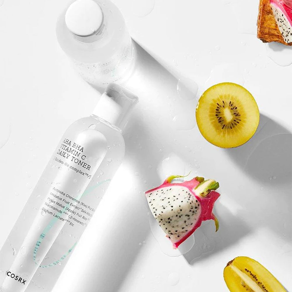 Der COSRX Refresh ABC Daily Toner enthält eine Kombination aus Alpha- und Beta-Hydroxysäuren (AHA/BHA) sowie Vitamin C, um die Haut zu klären, zu glätten und zu erneuern. Die AHA- und BHA-Säuren wirken als chemische Peelings und entfernen abgestorbene Hautzellen, um den Hautton auszugleichen und das Erscheinungsbild von feinen Linien und Falten zu reduzieren. Vitamin C wirkt als Antioxidans und trägt dazu bei, die Haut vor schädlichen Umwelteinflüssen zu schützen und den Hautton zu verbessern.