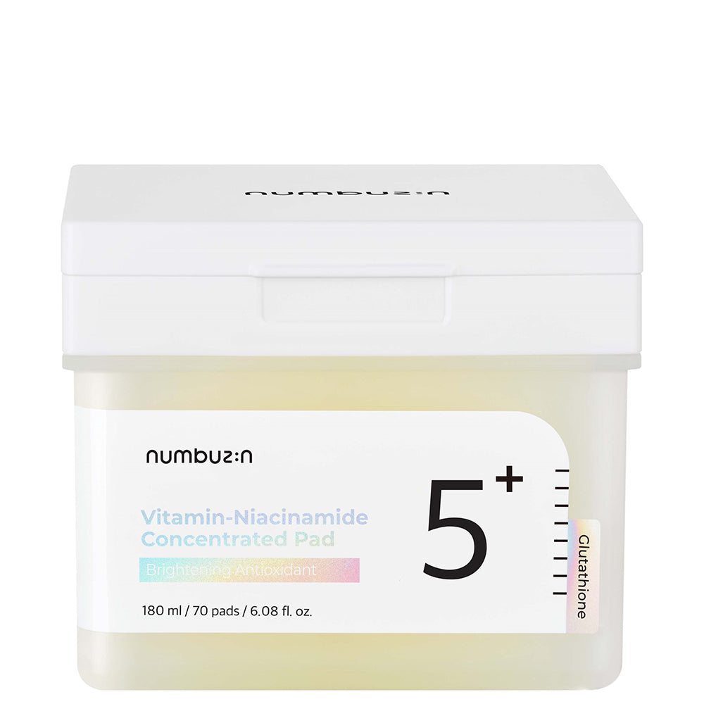 "Die Numbuzin No.5+ Vitamin-Niacinamide Concentrated Pads sind hypoallergene, doppelseitige Pads für das tägliche sanfte Peeling empfindlicher Haut zur reizlosen Bekämpfung von Hautunreinheiten und unerwünschter Pigmentierung. Dieses Pad verwendet eine wirksame Antioxidantienmischung aus 99 % reinem Glutathion, Tranexamsäure und 5 % Niacinamid und sorgt für eine intensive aufhellende Pflege. Es ist klinisch erwiesen, dass es den Melaningehalt der Hautoberfläche in nur zwei Wochen um 8,04 % verringert und die Gleichmäßigkeit des Hauttons um 15,07 % verbessert und bei regelmäßiger Anwendung für glattere, klarere und strahlendere Haut sorgt.