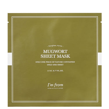 Die I’m from Mugwort Sheet Mask ist eine dünne, transparente und stark haftende Sheetmaske, die in einer hochkonzentrierten Essenz getränkt ist um die Wirkstoffe gezielt an die Haut abzugeben und sie effektiv mit Nährstoffen zu versorgen. Die I’m from Mugwort Sheet Mask enthält 91,45% reines Beifuß-Extrakt aus Ganghwa, dass dank seiner beruhigenden und entzündungshemmenden Eigenschaften trockene und gereizte Haut mit Feuchtigkeit versorgt, sie pflegt und Rötungen der Haut lindert.