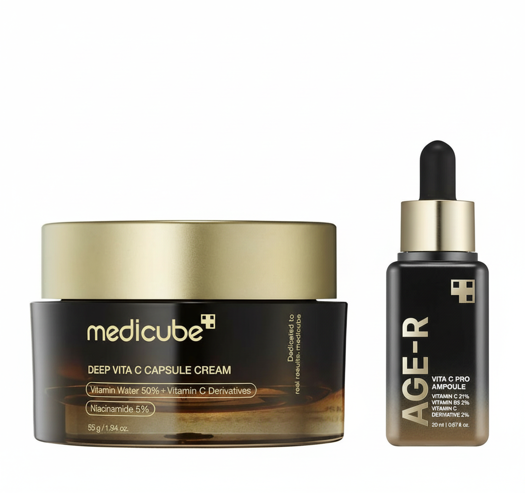 Das Medicube Anti-Aging Set kombiniert die hochwirksame Age-R Vita C Pro Ampoule mit der Deep Vita C Capsule Cream zu einer intensiven Pflegeroutine, die Pigmentflecken reduziert, Fältchen entgegenwirkt und die Haut jugendlich strahlen lässt.