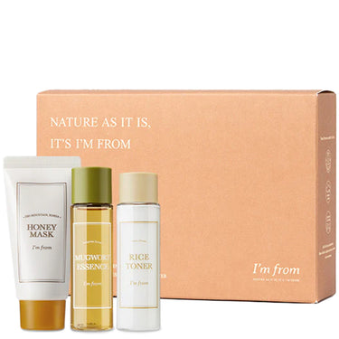 Dieses Kit ist eine Sammlung von I'm From Bestseller-Miniaturen – Honey Mask, Mugwort Essence und Rice Toner. Es ist der einfachste Weg für dich zu testen, welche Gesichtspflege am besten zu deiner Haut passt. Oder, falls du diese bereits besitzt, ist dieses kleine Trio perfekt zum Mitnehmen auf Reisen. Nähre, beruhige und hydratisiere deine Haut mit diesen Reise-Minis.
