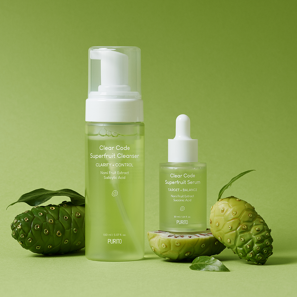 Das Clear Code Superfruit Serum nutzt die Kraft von Noni-Fruchtextrakt, um das Hautmikrobiom ins Gleichgewicht zu bringen und die Haut zu klären. Dieser Superwirkstoff hilft, das Gleichgewicht im Hautbild wiederherzustellen und unterstützt die Verringerung von bakteriellem Ungleichgewicht, das oft zu fettiger Haut führen kann. Durch seine beruhigenden Eigenschaften fördert er eine harmonisierte Hautflora.